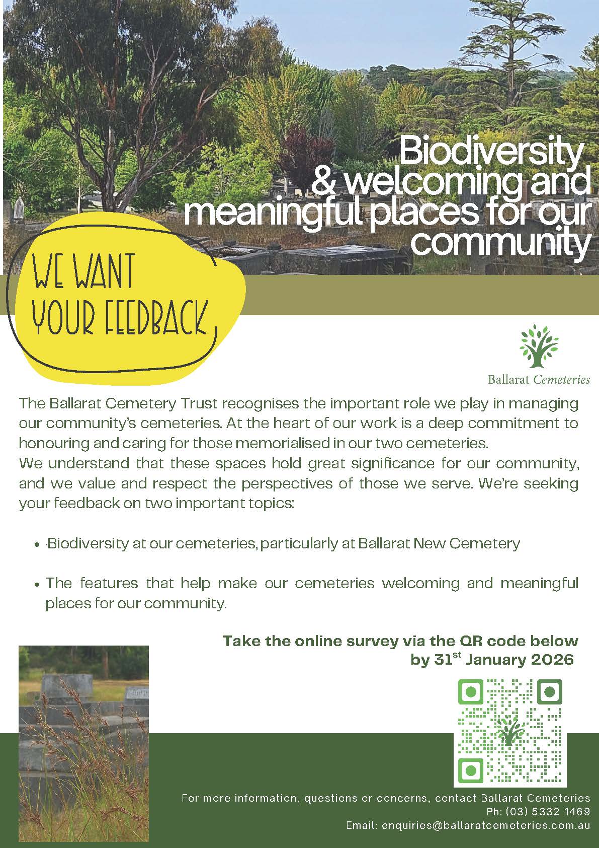 We’re seeking your feedback on two important topics: * Biodiversity at our cemeteries, particularly at Ballarat New Cemetery * The features that help make our cemeteries welcoming and meaningful places for our community. Take the online survey via the below QR code by 31st January 2026